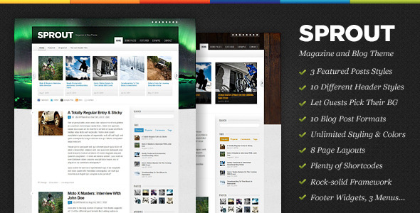 wordpress杂志/博客主题Sprout是一款适合网路杂志或个人博客的wordpress主题。易于改变站点外观和品味,因为带有10套独特的风格,自定义头部和无限的色彩选项。此外采用了稳定的主题框架Feather设计。