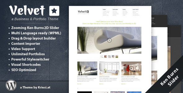 Velvet是一款简约风格的企业和作品wordpress主题,使用了优雅的 Ken Burns 幻灯片作为图片展示。是主题森林网站较为流行的弹性主题之一。由于采用了动态模板构建技术,所以你完全可以方便的按照你自己的想法创建首页布局和其它页面布局。该wordpress主题具有结构化的文件夹和文件系统。在幻灯片管理上不需要插件。视频支持主机本地视频和 vimeo,youtube视频。整体布局干净简洁。
