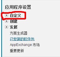 点击设置之后,在Salesforce的管理面板的左侧有一个“应用程序设置”菜单,点击其下面的“自定义”:
