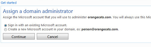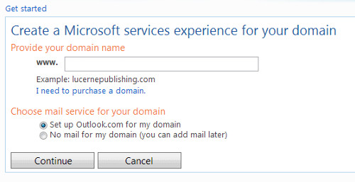 下面是让你选择是使用自己的域名还是使用微软的。我们当然是选择使用自己的域名如 yourname@yourdomain.com。另外你需要提供一个能够接收验证的邮件。