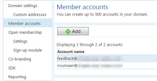 到 Windows Live Admin Center 并单击激活的域名。在左边你会看到管理域名帐户的选项。你可以选择 Open Membership,以便在你的域名邮件帐户里注册电子邮件帐户。其它的选项可以为你的职员,家庭成员,朋友或社区成员创建帐户。另外你还有权利在任何时候取消任何人的帐户。